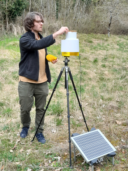 Installation de l’une des « caméra-traps » Velutina Monitor par son concepteur Nicola Storni de l’ETH Zurich (photo : C. Vogel)