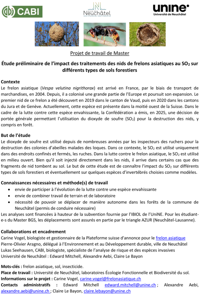 Sur la base de résultats préliminaires, un travail de Master sur l’impact des traitements des nids de frelons asiatiques au SO2 sur différents types de sols forestiers est actuellement proposé aux étudiants de l’Université de Neuchâtel. Ci-dessous son descriptif en français et en anglais.