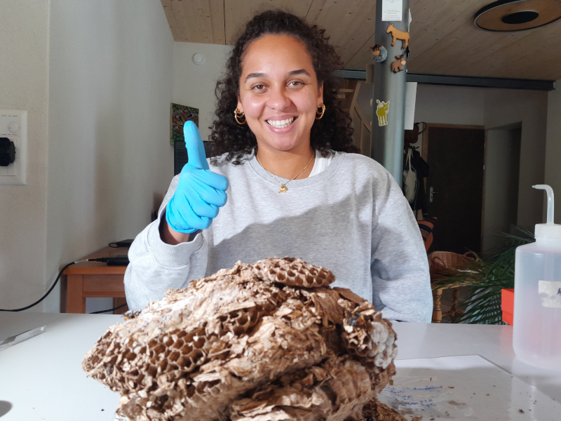 Mélissa Michel a débuté son travail de Master avec le professeur Christophe Praz de l’Université de Neuchâtel en été 2025 en prélevant des larves dans des nids récoltés tout au long de la saison. Ce sont près de 800 larves, pour un total de 84 nids, qui seront analysées durant l’hiver afin d’évaluer l’impact potentiel de l’espèce sur la biodiversité locale. L’étude examinera de manière plus ciblée la présence d’espèces d’abeilles indigènes, évaluant ainsi dans quelle mesure ces pollinisateurs locaux sont exposés à la prédation du frelon asiatique.