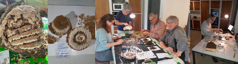 Illustrations de l’analyse des nids (secondaires et primaires) par une petite équipe de la Commune de Neuchâtel. Chaque frelon adulte est évalué dans sa condition physique, sexé, puis pesé.