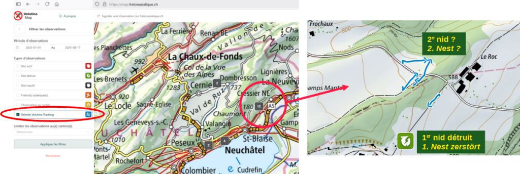 Extraits de la carte (map.frelonasiatique.ch) et exemple d’utilisation des filtres à des fins d’organisation de la lutte sur un plan régional