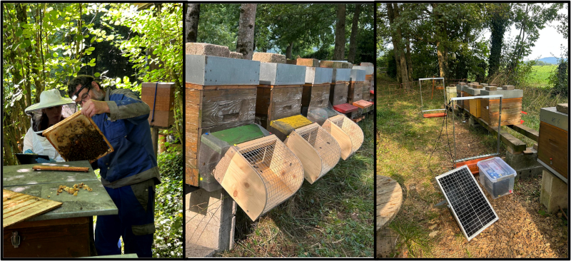 Illustrations du travail pour les tests des muselières et des harpes électriques en collaboration avec des apiculteurs du Jura (photos : L. Seehausen, CABI)